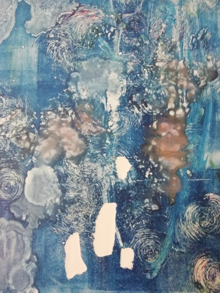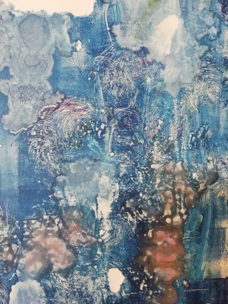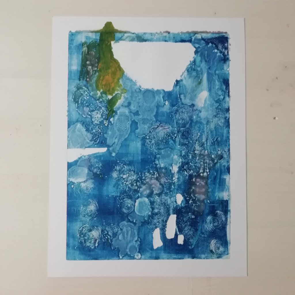 La tecnica del monotipo consiste nel dipingere un’immagine su lastra di alluminio che viene successivamente stampata con la pressione di un torchio calcografico. Gli effetti pittorici che si possono realizzare sono molteplici e vistosi e offrono infinite possibilità espressive. Per realizzare le pietre bianche ho sovrapposto dei pezzi di carta protettiva sulla superficie, una “mascheratura”, poi tolta alla fine della fase di stampa.