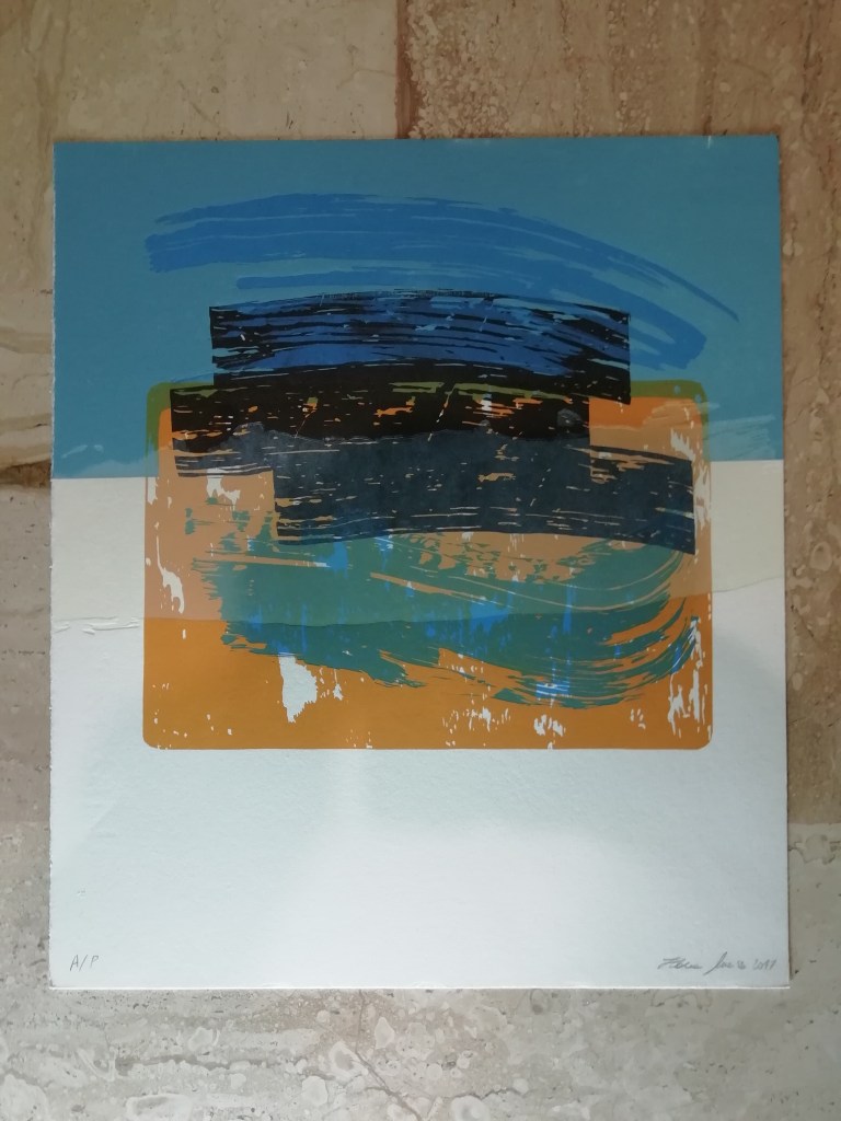 Il linoleum da me realizzato è ispirato al tema della legalità e all’importanza del contrasto al lavoro nero e alla mafia. Essi sono “cancellati” dai tocchi sferzanti di azzurro e di bianco simboleggianti l’azione positiva delle Fiamme Gialle. L’immagine si ispira anche allo stemma della Guardia di Finanza.